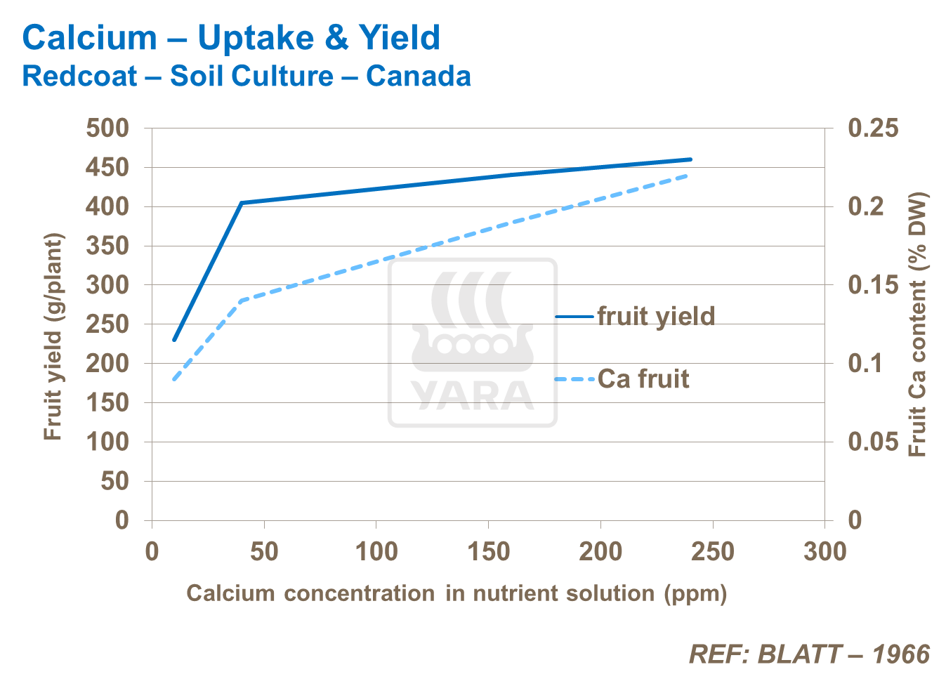 Absorbția deficitară a calciului - în special atunci când este în afara echilibrului cu K și Mg - conduce la necroză și arsura vârfurilor. În acest studiu, necroza peţiolului, leziunile de pe tulpină, flori și arderea vârfurilor lăstarilor au crescut cu scăderea Ca și creșterea disponibilității Mg în soluția de nutrienți. Arsurile pot fi minimizate prin scăderea CE pe timp de noapte. Absorbția și distribuția calciului sunt favorizate noaptea când presiunea de aspirație a xilemului poate împinge apa și calciul în țesuturile joase sau netranspirative, cum ar fi vârfurile frunzelor închise și fructele. Aprovizionarea regulată a calciului pe tot parcursul ciclului de producție asigură Ca necesar pentru integritatea fructului, el își va găsi drumul în fructe și va crește producţia.