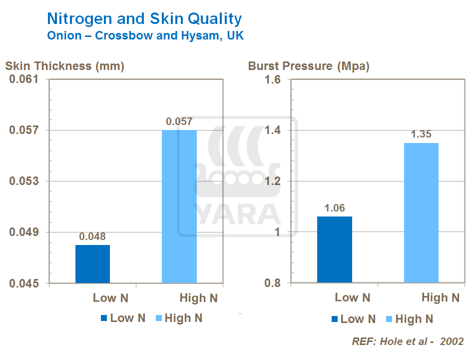 Studiile arată că azotul îşi exercită efectul pozitiv asupra calităţii cojii de ceapă prin intensificarea greutăţii specifice a cojii exterioare. Acesta este un factor extrem de important în ceea ce privește depozitarea.