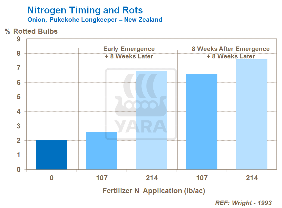 Surplusul de azot poate înmuia bulbul de ceapă și intensifică riscul apariţiei unor boli de putrezire în timpul depozitării. Din cauza conţinutului ridicat de N se poate produce îngroşarea gâtului cepei, iar acesta este o oportunitate pentru agenţii patogeni pentru pătrunderea în gâtul plantei. Este responsabil pentru îngroşarea părţii de gât, pentru putrezirea în timpul depozitării şi pentru coacearea târzie pentru motivul aplicării târzii a nitrogenului. Din acest motiv are o importanţă critică aplicarea nitrogenului în cantitate şi la momentul corespunzător, pentru asigurarea producţiei maxime fără influenţarea negativă a calităţii de depozitare.