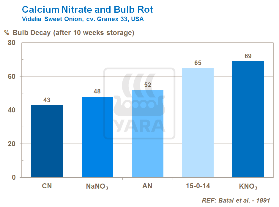 Despre azotatul de calciu s-a dovedit faptul că este cea mai eficientă compoziție atunci când vrem să reducem la minim apariţia putregaiului în timpul depozitării cepei. Este important ca K şi Ca să se afle în echilibru.