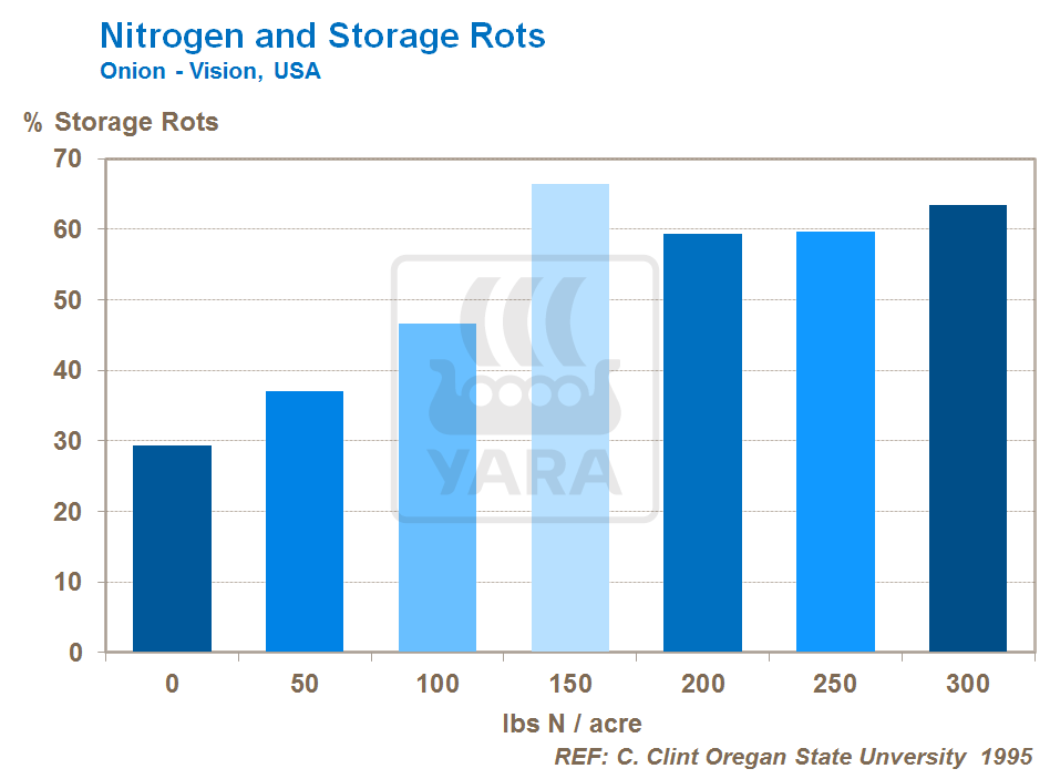 Aprovizionare excesivă cu azot poate duce la putrezire în timpul depozitării, ceea ce reprezintă o pierdere în timpul depozitării. Acest lucru poate slăbi şi țesuturile vegetale, ceea ce face mai sensibil ceapa la daunele cauzate de îngheţ.O alimentare echilibrată de nutrienţi va ajuta atenuarea putrezirii pe timpul depozitării prin asigurarea unei plante sănătoase.