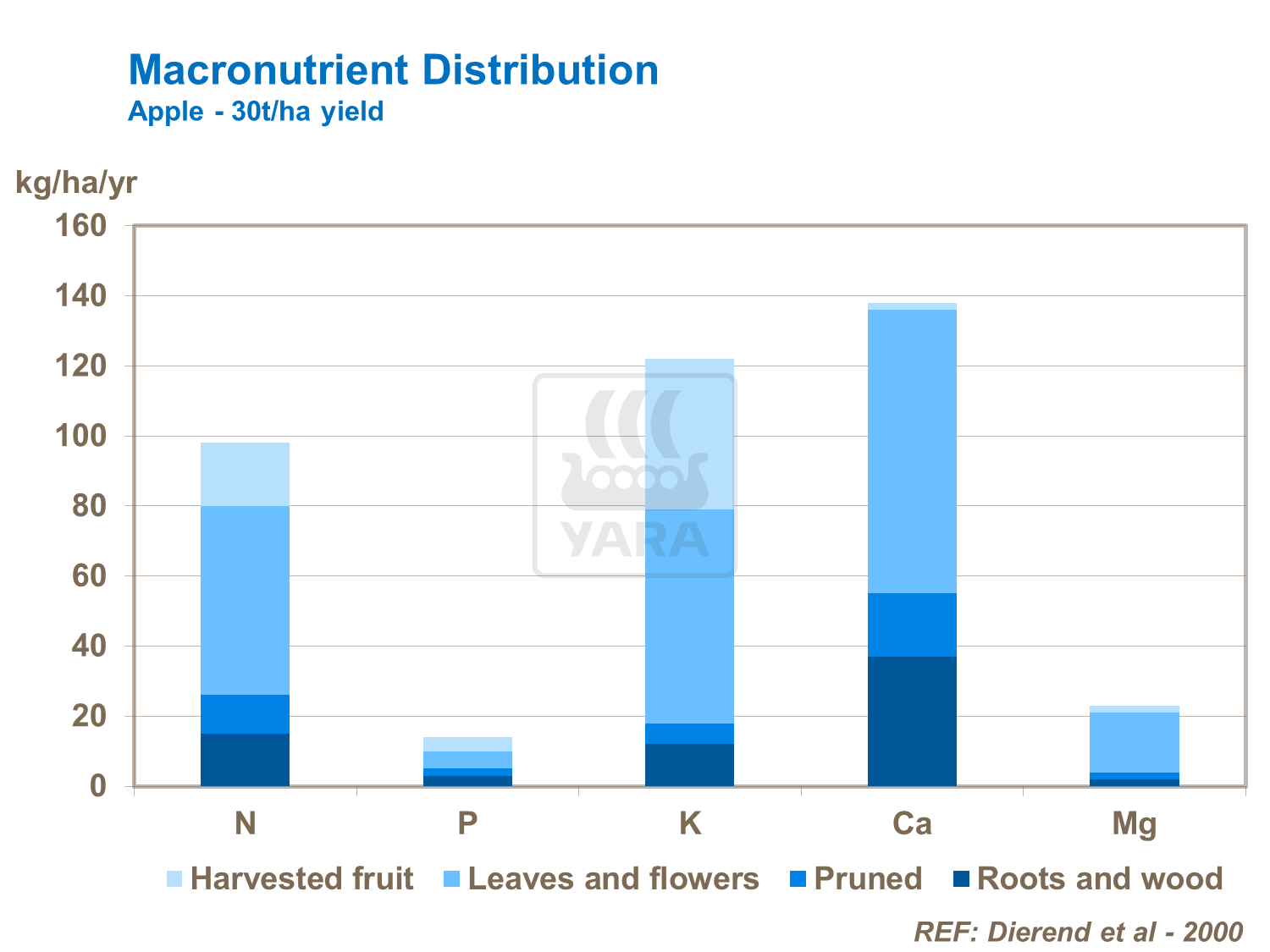 Cei mai importanţi macro-nutrienţi în cazul pomilor cu rodire bună sunt calciul, potasiul şi azotul. Pentru creşterea sănătoasă este necesar ca pomul să conţină o cantitate mare de calciu. Deși din cantitatea totală de calciu ajunge doar o mică proporție în fruct, această concentrație scăzută este de o importanţă critică în minimizarea pierderii de calitate în timpul depozitării. O partea semnificativă din cantitatea de azot va fi utilizată la începutul sezonului, asigurând creșterea vegetativă a frunzelor, înflorirea şi solidificarea fructelor.