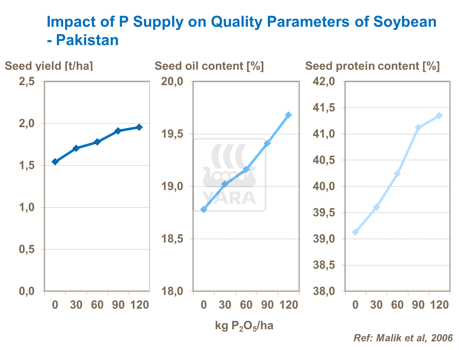 Fosforul este important pentru obținerea unei culturi de calitate, așa cum se poate vedea din aceste experimente în Pakistan. Îmbunătățește rata de fotosinteză, transferul de energie, activitatea enzimatică, dezvoltarea rădăcinilor, mișcarea și absorbția altor nutrienți, producția de noduri și, prin urmare, fixarea azotului, creșterea și maturarea, numărul de semințe și dimensiunea și germinarea semințelor. Împreună cu potasiul poate reduce daunele datorate mai multor boli ale plantelor.