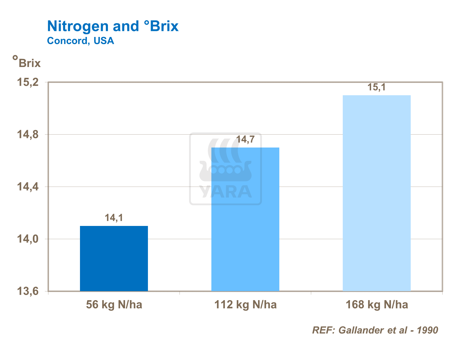 Având în vedere aspectele nutriționale, cu cât mai mare este disponibilitatea azotului, cu atât este mai mare conținutul de zahăr din struguri și producția potențială de alcool după fermentație, precum și zaharurile reziduale din vin, măsurate cu °Brix. Până la anumite niveluri, utilizarea de azot mărește conţinutul de zaharuri.