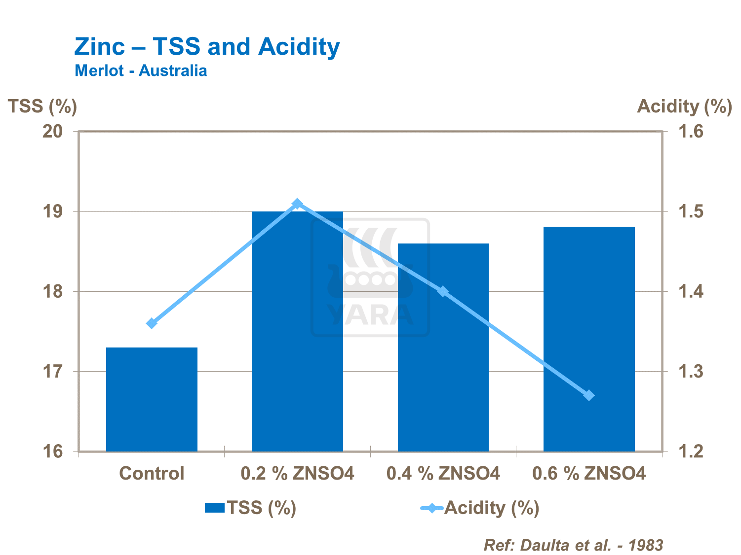 Borul și zincul aplicate foliar contribuie, de asemenea, la îmbunătățirea calității strugurilor prin creșterea conținutului de zaharuri TSS și reducerea acidității.