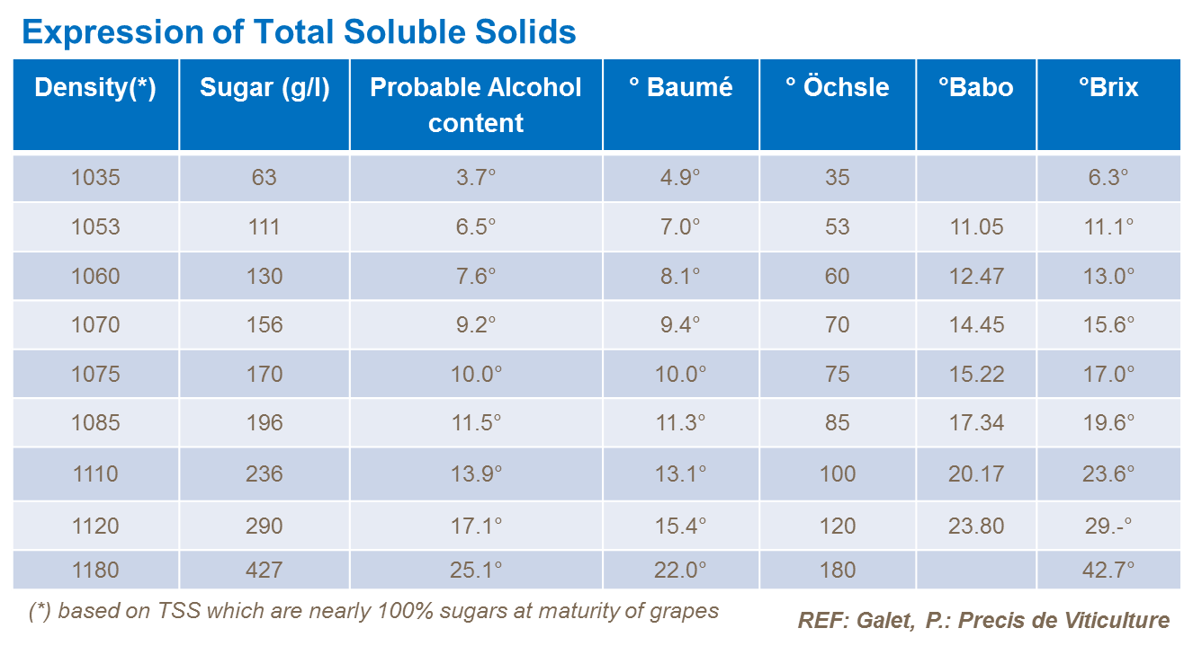 Conținutul de zahăr este măsurat și exprimat ca °Brix - sau °Baumé, °Öchsle, °Babo (Tabelul 1). Valoarea °Brix variază în funcție de tipul de struguri, iar nivelurile sunt stabilite pentru stilul vinului produs de fiecare fabrică de vin.